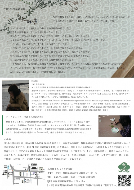 現代アート作家の宮本華子さんが11月3日(文化の日)に、新居関所お隣の「ヨハクINN」で、「つれづれ草ワークショップ」を開催されました。当日、参加者が植物を描かれた古い襖や畳とご自身が描かれた壁紙を小松楼二階で展示中です。開催日時など