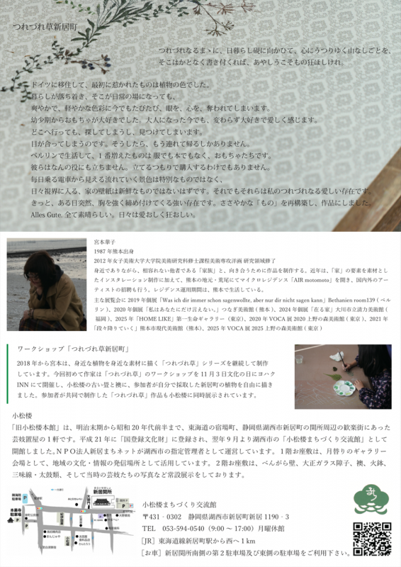 現代アート作家の宮本華子さんが11月3日(文化の日)に、新居関所お隣の「ヨハクINN」で、「つれづれ草ワークショップ」を開催されました。当日、参加者が植物を描かれた古い襖や畳とご自身が描かれた壁紙を小松楼二階で1月15日まで、展示中です。開催日時など