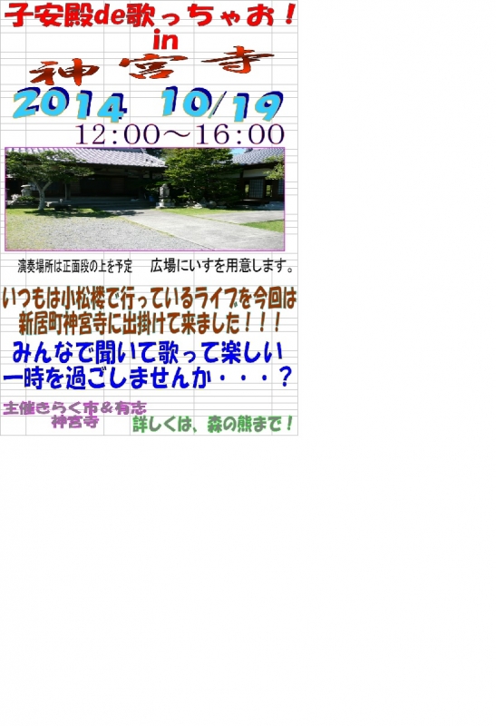第3日曜日の午後は、小松楼de歌っちゃお!ですが、今回10月19日は、寺道内の神宮寺さんの境内をお借りして、観音堂子安殿前でライブを行います。