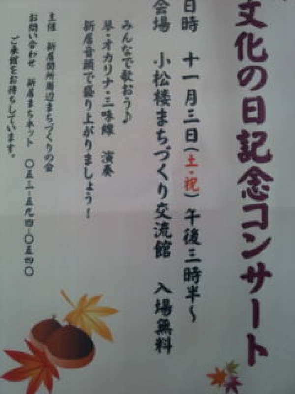 新居まちネットの者です。(初めて投稿します)コンサートはオカリナと琴の演奏に合わせて、来た人が歌ったり、それを聞いたりできるような感じです。