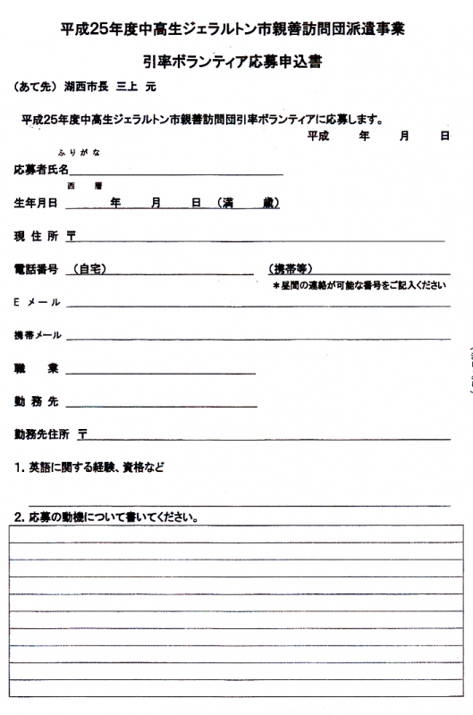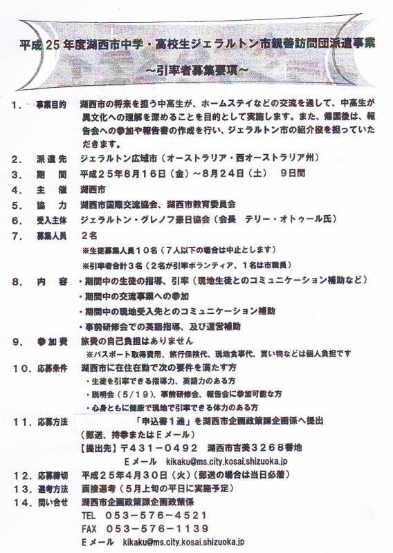 TOP > トピック一覧 > お知らせ > 引率ボランティア募集(平成25年度 湖西市中高生ジェラルトン市親善訪問)