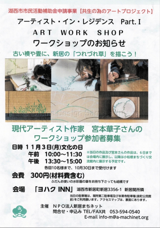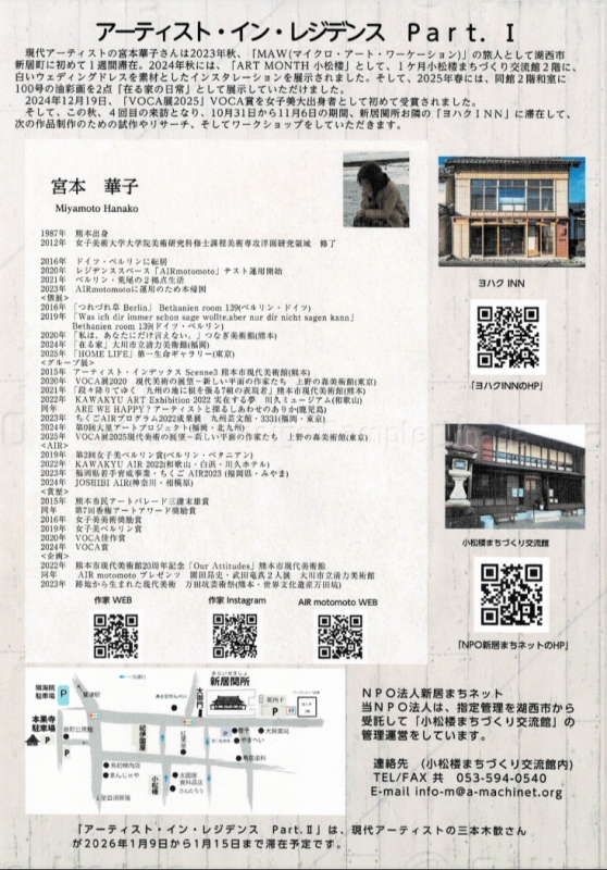 女子美出身で、2024年VOCA賞受賞者、現代アーティスト作家の宮本華子さんが湖西市新居町へ4度目の来訪。10月31日から11月6日まで、新居関所隣の「ヨハクINN」に滞在して、次の作品制作のための試作やリサーチ、そしてワークショップをしていただけます。開催日時など