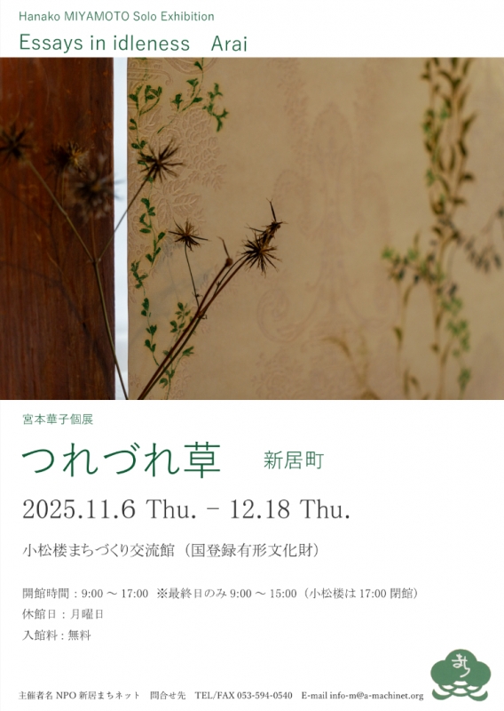 現代アート作家の宮本華子さんが11月3日(文化の日)に、新居関所お隣の「ヨハクINN」で、「つれづれ草ワークショップ」を開催されました。当日、参加者が植物を描かれた古い襖や畳とご自身が描かれた壁紙を小松楼二階で展示中です。開催日時など