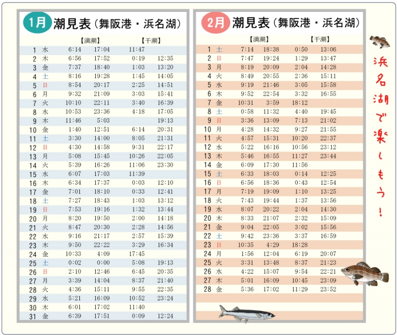 1月、2月の浜名湖、舞阪、潮見表