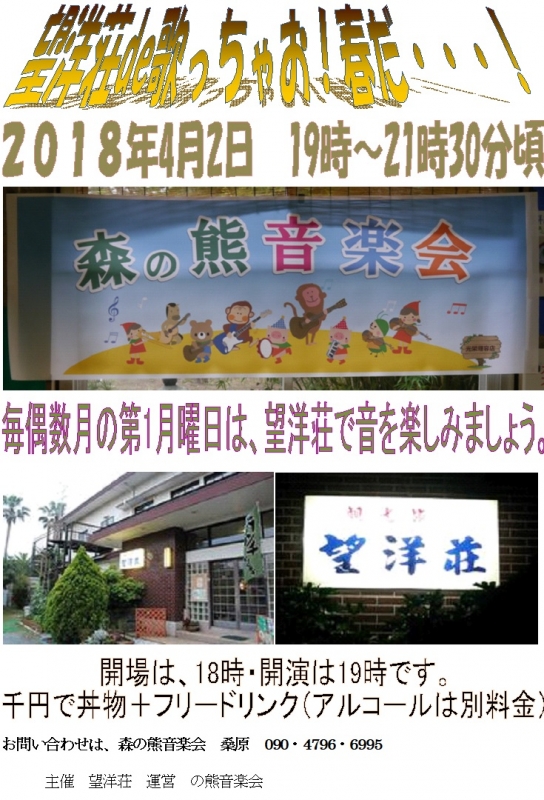 2018年4月2日午後18時開場19時開演の森の熊音楽会in望洋荘です。
