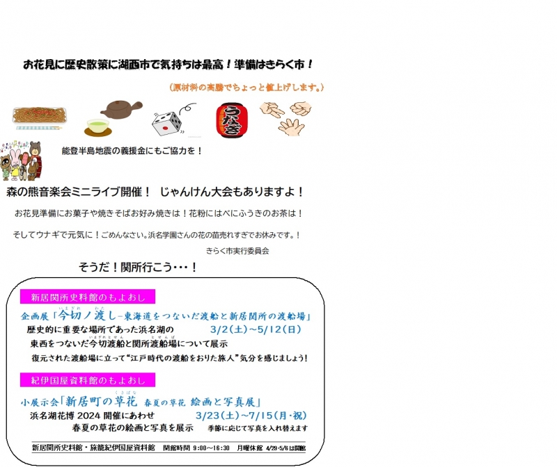 5月19日9時~12時頃まで湖西市新居関所駐車場にて朝市『きらく市』を開催いたします。今回は湖西市緑花フェアとブッキングしているので賑やかではないかもしれませんが、ゆっくり見物できるかも?森の熊音楽会も同時開催します。ご来場お待ちしております。 byきらく市実行委員会投稿者:光栄理容店 作成日:2024/05/17 08:19:18
