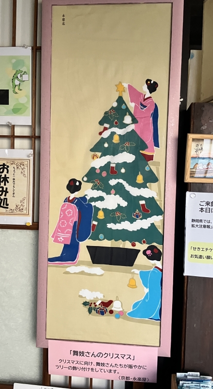 小松楼まちづくり交流館の玄関入ってすぐに、京都・永楽屋さんの手ぬぐい「舞妓さんのクリスマス」を展示中です。