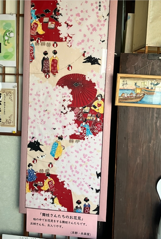 小松楼まちづくり交流館の玄関入ってすぐに京都・永楽屋さんの手ぬぐい「舞妓さんのお花見」を展示しました。